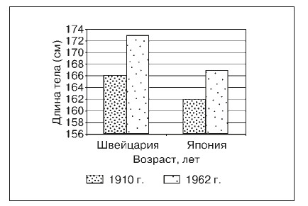 В настоящее время максимального роста девушки и юноши достигают в 16–19 лет, а 50 лет назад они достигали его к 20–26 годам. У 19-летних юношей в Швейцарии средние значения роста в 1888–1890 годах были 164 см, в 1962 г. – 173 см; в Японии эти показатели в 1910 г. составили 162 см, в 1962 г. – 167 см.