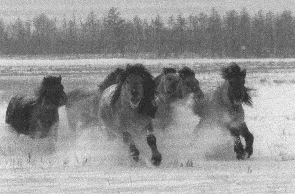 Лишь одно животное как ни в чем не бывало продолжает щипать траву, с завидным упорством добывая ее из-под снега. Зимой, в тайге, в заполярной и приполярной мгле, у самого полюса холода. Это удивительное создание — якутская лошадь.