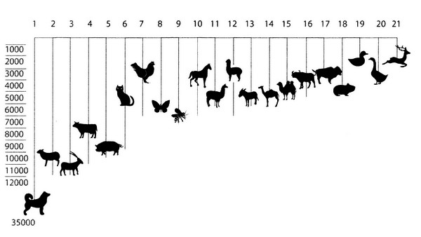 Время одомашнивания (тысячи лет): 1 — собака, 2 — овца, 3 — коза, 4 — крупный рогатый скот, 5 — свинья, 6 —кошка, 7 — курица, 8 — шелкопряд, 9— пчела, 10 — лошадь, 11 — лама, 12 — альпака, 13 — осел, 14 — одногорбый верблюд, 15 — двугорбый верблюд, 16 — водяной буйвол, 17 — як, 18 — морская свинка, 19 — утка, 20 — гусь, 21 — северный олень. Художник Алина Коноваленко