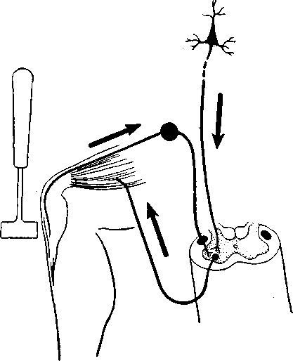 Удар молоточка растягивает коленное сухожилие. Чувствительные органы, имеющие форму веретена, попадают под удар и вступают в действие. Под их воздействием вдоль чувствительных нервов пробегают электрические разряды от колена до спинного мозга. В спинном мозгу «моторные нервные клетки» воспринимают раздражение, и через их длинные отростки (нервные волокна) разряды доходят до мышц бедра, где мышечные волокна сокращаются, и пациент невольно вскидывает ногу.