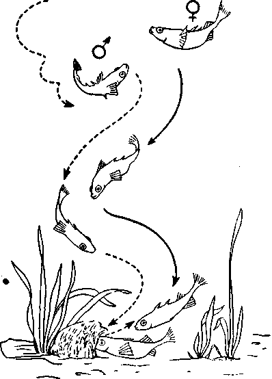 Окружающая среда стимулирует самца колюшки к устройству гнезда, которое он строит, главным образом, из растений. В длинной цепи рефлексов первым звеном и является постройка гнезда. Только после этого может наступить очередь следующего звена этой цепи. Внешним раздражителем его является появление такой самки, [48] раздутый живот которой указывает на то, что она готова метать икру. Под влиянием вида такой самки самец начинает характерно плавать, делая зигзаги. До тех пор, пока самец строил гнездо, его окраска сливалась с окружающей средой. В тот момент, когда самец замечает самку, он приобретает блестящую окраску брачного периода. Окраска самца и зигзагообразное плаванье привлекают самку, она приближается к нему. Завидев приближающуюся самку, самец направляется к своему гнезду. Самка следует за ним: самец «ведет» ее. Это тоже рефлекс. В этот момент самец указывает самке вход в гнездо, просовывая в него голову. Следующий этап: самка проникает в гнездо. Если сейчас самца забрать отсюда, то цепь рефлексов самки прервется, и она не станет метать икру. В естественных условиях в это время самец начинает трястись, и в ответ самка мечет икру в гнезде. Затем самец оплодотворяет икру.