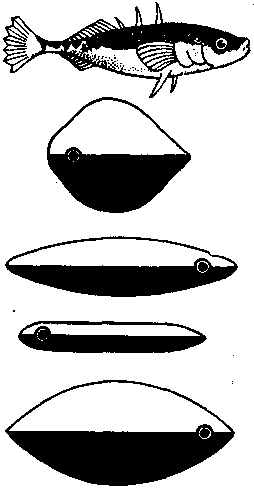 Как известно, «исходной точкой» отдельных рефлексов является соответствующее раздражение окружающей среды. Значение этого факта хорошо иллюстрируется [49] следующим примером. Исследователь Тинберген изготовил модели рыб, которые воздействовали на самца колюшки таким же образом, как живые рыбы. Выяснилось, что даже незначительные факторы определяют поведение животных. Например, самец принимает каждую модель рыбы, если она окрашена снизу в красный цвет, за самца и готовится к нападению (см. рисунок на стр. 50).