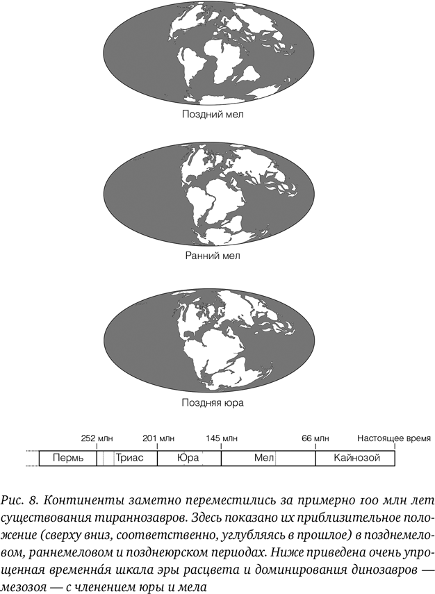 Несомненно, тираннозавры населяли значительные пространства в течение большей части своего существования, и хотя они так никогда по-настоящему и не укоренились на юге, в меловом периоде в целом и в позднемеловом в особенности их было множество – и видов, и особей. Несмотря на некоторые пробелы в наших знаниях, общая картина распространения вполне ясна, и хотя новые открытия могут дать больше информации, кажется маловероятным, чтобы мы вдруг обнаружили, скажем, некую неизвестную вспышку видообразования в Северной Америке или выяснили, что происходил некий масштабный обмен видами между Южной Америкой и Азией. Тем не менее, по-видимому, тираннозавры много путешествовали: другие группы также пришли в итоге к широкому распространению, однако в настоящее время мы не видим у них таких перемещений в разных направлениях, как у крупных тираннозавров.