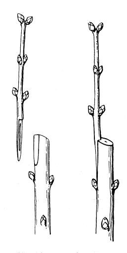 На оставленном пеньке проводят косой срез в виде «лыски», проходящий наискось, захватывающий только часть поверхности и соответствующий косому срезу на черенке.