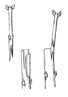 На черенке, после проведения седлообразного выреза и косого среза, в верхней его части делают поперечный надрез на 1/3 толщины черенка. Затем ниже, на расстоянии ширины ножа, продольным срезом вынимают клинообразную полоску. После этого черенок прикладывают к подвою так, чтобы срезы совместились. Обвязку проводят, как при копулировке вприклад. В этом случае особенно внимательно следят, чтобы черенок не сдвинулся.