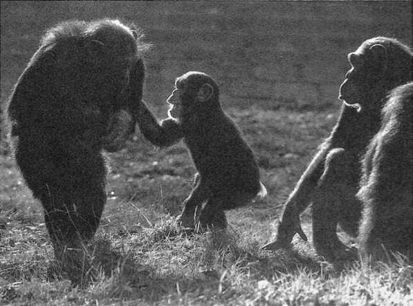 День, когда шимпанзе выходят из зимних помещений, – самый большой праздник в году. Утром сотрудник зоопарка открывает люк, который ведет в открытый вольер. Обезьяны из своих спальных загонов не могут видеть, что происходит, однако они могут различать звуки, производимые всеми люками в помещении, на слух. В мгновение ока вся колония реагирует оглушительным криком. На открытый воздух их выпускают небольшими группами. Вопли и крики не утихают. Видно, как обезьяны повсюду обнимают и целуют друг друга. Иногда они образуют группы из трех или большего числа особей, которые в возбуждении прыгают и хлопают друг друга по спине.