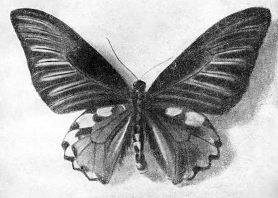 Летавшие всюду огромные бабочки были прекрасны. Сердце охотника начинало тревожно и радостно биться всякий раз, когда над деревьями появлялась «Орнитоптера», сверкавшая в солнечных лучах золотом или изумрудами. Само название показывает, как велика красавица: Орнитоптера по-русски означает «Птицекрыл». И правда, бабочка эта величиной чуть ли не с дрозда.
