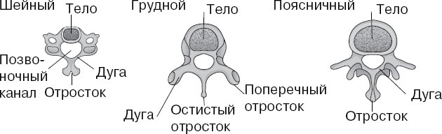 Позвонки всех отделов позвоночного столба имеют схожее строение — состоят из тела (передняя часть) и дуги (задняя часть). Тело является опорной частью позвонка. Позади тела располагается дуга, которая соединяется с телом при помощи двух ножек, образуя позвоночное отверстие Отверстия всех позвонков составляют позвоночный канал, в котором располагается спинной мозг.