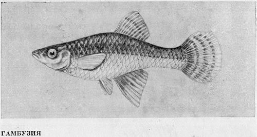 Эта маленькая рыбка по внешнему виду похожа на гуппи. Самцы имеют размеры 3 см, самки — 6 см. Окраска тела довольно невзрачная, серовато-зеленая, плавники бесцветные. Рот направлен кверху. В Подмосковье гамбузия живет в прудах-охладителях тепловых электростанций. Эти пруды зимой не замерзают, а летом вода в них нагревается до 30 °C. При температуре воды ниже 10° гамбузия зарывается в ил и впадает в спячку. Спаривание у нее начинается весной, в конце апреля-начале мая. Через 3–4 недели рождаются мальки. Они крупные, длиной 8-10 мм, полностью сформированы и тотчас начинают плавать и активно питаться. За лето самка успевает принести три помета, в каждом из них от 50 до 70 мальков. Гамбузия — удивительно скороспелая рыбка: уже через 1,5–2 месяца после рождения мальки становятся половозрелыми. Живет гамбузия очень недолго, около 3 лет. Ее пищей являются личинки насекомых и планктонные ракообразные, молодь питается инфузориями и другими мельчайшими организмами. Для гамбузии характерны очень резкие колебания численности: в отдельные годы в водоеме ее может быть очень много, затем она почти исчезает. В начале 60-х годов гамбузией буквально кишели пруды — охладители тепловой электростанции в г. Электрогорске Московской области. Гамбузия весьма нежелательна в рыбоводных хозяйствах, так как она уничтожает икру и личинок карпа и является серьезным пищевым конкурентом для его молоди.