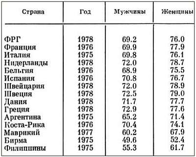 Особенности развития экономики, совершенствования и распространения здравоохранения делают понятными различия в средней продолжительности жизни в европейских странах и развивающихся странах Азии, Африки и Латинской Америки (табл. 1). Низкая продолжительность жизни во многих странах Африки и Азии — наследие длительного колониального режима со всеми его последствиями: низким уровнем материального обеспечения, нищетой, голодом или недоеданием, плохими жилищными и санитарно-гигиеническими условиями, тяжким физическим трудом, отсутствием необходимых эпидемиологических и общегигиенических мероприятий, недостатком квалифицированной медицинской помощи и др.