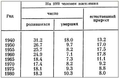 Иная динамика роста населения в развитых странах. В 1986 г. родился 280-миллионный житель нашей страны. В СССР, как и в других развитых странах, рождаемость в последние десятилетия существенно снизилась. Вместе с тем показатель общей смертности несколько повысился, что является следствием увеличения доли пожилых людей в структуре населения. Это, естественно, ведет к уменьшению прироста населения (табл. 3). Анализируя таблицу, следует отметить наметившуюся у нас в стране тенденцию к увеличению рождаемости.