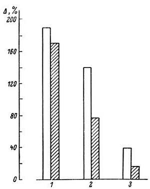 Рис. 5. Индуктивный синтез цитохрома Р-450 (1), аминопириндеметилазы (2) и белка микросом (3) печени крыс при введении фенобарбитала. Светлые столбики — взрослые животные, заштрихованные — старые
