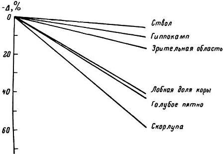Рис. 6. Схема гибели нервных клеток, неодинаково выраженная в различных структурах мозга. По оси ординат — % убыли числа нейронов