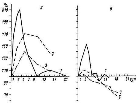 Рис. 8. Влияние введения гормона (3.5 мг/кг гидрокортизона) на 'истощение' генетической индукции ферментов в печени взрослых (А) и старых (Б) животных.