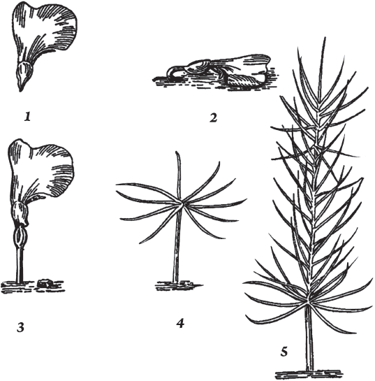 Рис. 108. Ливанский кедр: 1 — семя, 2 — через 2 дня, 3 — через 2 недели, 4 — через 2 месяца, 5 — через 2 года.