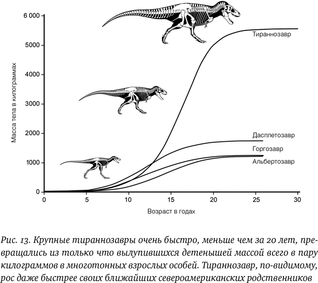 Только что вылупившийся детеныш тираннозаврина мог быть всего около метра длиной и весить килограмм или два: нечто близкое по размеру к крупной домашней кошке или небольшой собаке. Однако к двум годам он уже мог достигать 30 кг, а к 15 годам приближаться к 2 т. К возрасту около 20 лет он, вероятно, дорастал до полного взрослого размера, т. е. метров 10–12 в длину, и весил больше 5 т{49}. Это должно подразумевать некую экстремальную скорость роста, по-видимому, бо?льшую, чем у других динозавров, включая большинство тираннозавров – сравните тираннозавра с дасплетозавром и альбертозавром на рис. 13, – однако все эти животные, несомненно, росли быстро.