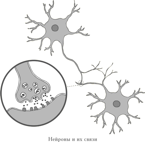 Как и положено хорошему преподавателю, доктор Даймонд сделала совершенно очевидным то, что поначалу казалось нам непостижимо сложным: она рассказала, что эта большая и сложная масса биологической ткани на самом деле состоит всего из двух типов клеток – нейронов и клеток нейроглии. Нейроны – рабочие лошадки мозга. Каждый из них состоит из тела клетки (или «центра управления»), «входных» структур, именуемых дендритами и внешне напоминающих древесные ветви (они получают информацию, поступающую в тело клетки) и тонкую структуру вывода, которая называется аксон и тоже может иметь множество ветвей. От всех прочих клеток человеческого организма нейроны отличаются тем, что умеют обмениваться сигналами. Они делают это при помощи коротких импульсов электрической активности, называемых потенциалами действия, или пиковыми потенциалами. Передача сигнала от аксона одного нейрона дендриту второго происходит в особой коммуникационной точке между ними – синапсе. Именно электрическая «болтовня» мозга, то есть передача информации от аксона к дендриту, составляет основу всего, что делает мозг.