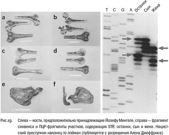 Из останков, найденных в Бразилии, удалось извлечь около нанограмма ДНК, а затем амплифицировать участок, содержащий повторы (СА)n. У исследователей имелась также ДНК Рольфа и его матери. Анализ показал, что останки принадлежат Йозефу Менгеле[40] – отцовские аллели, то есть те, которые сын не мог получить от матери, присутствовали в ДНК, извлеченной из останков. По совокупности результатов, полученных для десяти локусов (участков) STR отношение вероятностей “Менгеле: неизвестный посторонний” составило 1800:1. Дело можно было считать закрытым.