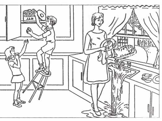 Приведенный выше сюрреалистический рисунок используется психологами в одном из тестов на умственные расстройства. Вот как описывает этот рисунок пациент, страдающий афазией Вернике: “Ну, здесь... мать ушла работать тут свою работу там отсюда, чтобы лучше, но когда она смотрела, два мальчика смотрели в другой части. Одна их маленькая плитка здесь в ее время. Она работает в другой раз, потому что готовится. И вот два мальчика работают вместе, и один тайком пробирается, делает свою работу, а ему дальше развление в тот раз у него была”26.