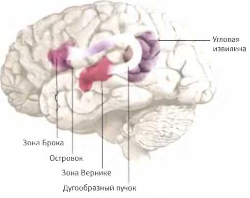 Речевые зоны коры, расположенные у 95 % людей в левом полушарии, со всех сторон окружают слуховую кору. Они занимают более половины поверхности височной доли левого полушария и достигают ее краев, заходя на теменную и лобную доли. Две главные речевые зоны — Вернике и Брока — были открыты более века назад, но результаты недавних исследований с использованием методов нейровизуализации указывают на то, что в речевых функциях задействованы и некоторые другие зоны. К их числу относится часть островка — скрытого участка коры, расположенного внутри большой складки, так называемой сильвиевой борозды, отделяющей друг от друга височную и лобную доли22. Давно предполагалось, что каждая из главных речевых зон коры разделена, подобно зонам сенсорной коры, на множество отделов и подотделов, обрабатывающих разные типы информации, но лишь в последние несколько лет методы нейровизуализации позволили нам начать разбираться в этой системе.