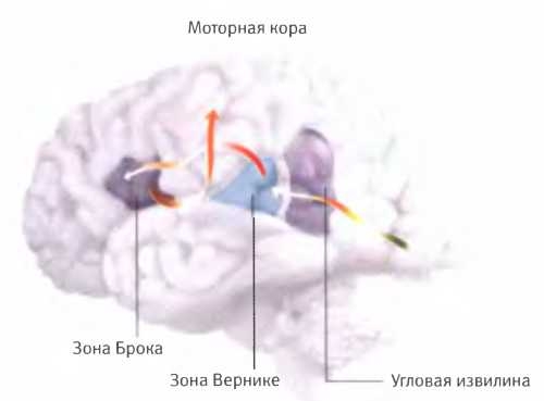 Непосредственно за зоной Вернике и немного выше ее располагается участок мозга, где (на краях затылочной, теменной и височной долей) сталкиваются зрительная, пространственная и речевая системы. Этому участку соответствует выпуклость — угловая извилина, которая, по-видимому, служит мостом между системой распознавания зрительных образов и остальными системами, связанными с языком. Повреждения угловой извилины могут приводить к нарушениям навыков чтения и письма одновременно. Если же повреждается область, окружающая угловую извилину, это может приводить к весьма специфическому расстройству, при котором человек сохраняет способность писать, но лишается способности читать про себя. Одна женщина, известная под инициалами J. О., понимает устную речь и умеет писать как здоровый человек, но когда она пытается прочитать про себя текст, который сама только что написала, то не может понять ни слова. Однако если попросить ее прочитать написанное вслух, оказывается, что она вполне может это сделать, и на слух, по собственному голосу, понимает смысл текста30. “Я вижу слова, но они до меня не доходят”, — объясняет пациентка. По-видимому, этот странный недуг развивается, когда оказывается перекрыт или разорван нейронный путь, соединяющий зрительную кору с угловой извилиной, в результате чего информация о читаемых словах не может сопоставляться с информацией об их смысле. Тем не менее человек при этом может читать слова, потому что зрительная информация по-прежнему может сопоставляться со звуковой (должно быть, посредством другого нейронного пути).