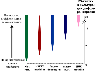 Было обнаружено, что ряд этапов Х-инактивации совпадает с началом аккумуляции Xist-PHК в дифференцирующихся ES-клетках XX. В их число входят рекрутирование белков PcG и ассоциированное с этим метилирование H3K27, моноубиквитинирование H2A, деацетилирование H3K9 и утрата метилирования в H3K4 (Heard et al., 2001; Silva et al., 2003; de Napoles et al., 2004; Rougeulle et al., 2004). Глобальное деацетилирование гистонов — относительно позднее событие, происходящее в большинстве клеток на 3—5-й день; поэтому весьма вероятно, что оно участвует в поддержании и (или) стабилизации неактивного состояния, а не в его инициации (Keohane et al., 1996). Такая трактовка предполагает, что паттерны ацетилирования в промоторах отдельных генов, претерпевающих инактивацию, отражают паттерны, определяемые с помощью иммунофлуоресцентного анализа целой хромосомы или крупных доменов. Первоначальные исследования с использованием ChIP, заставляют предполагать, что это действительно так, однако необходимы дальнейшие эксперименты с вовлечением большего числа генов (O’Neill et al., 2003).