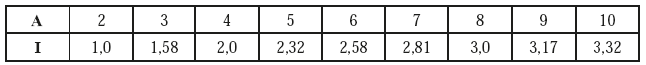 Соотношения количества информации (I, бит) и числа альтернативных выборов (А)