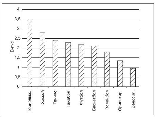 Пропускная способность мозга (по данным разных авторов) у квалифицированных спортсменов при напряженной спортивной деятельности колеблется в пределах 0,5–3 бит/с (рис. 71). Например, пропускная способность (бит/с) составляет у горнолыжников 3,5; у хоккеистов 2,8; у теннисистов 2,38; у гандболистов 2,33-3,01; у футболистов 2,28-2,85; у баскетболистов 1,66-2,14; у волейболистов 1,7; у ориентировщиков 0,84-1,28; у велосипедистов-шоссейников 0,62-0,96.