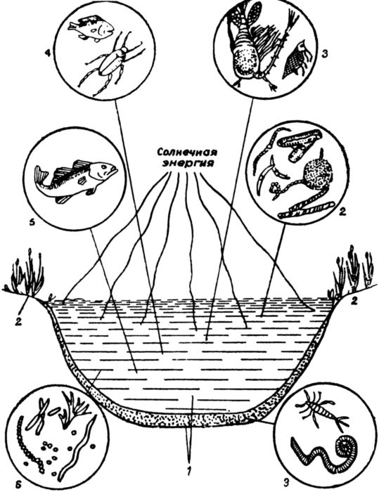Циклы питания в пресноводном пруду: 1) минеральные и органические вещества в воде и грунте; 2) производители органических веществ — растения и микроскопические водоросли. Потребители: 3) различные рачки и другие беспозвоночные, питающиеся растительной пищей; 4) жуки и плотоядные рыбы; 5) хищные рыбы; 6) бактерии и грибы, разрушающие органические соединения до минеральных веществ.