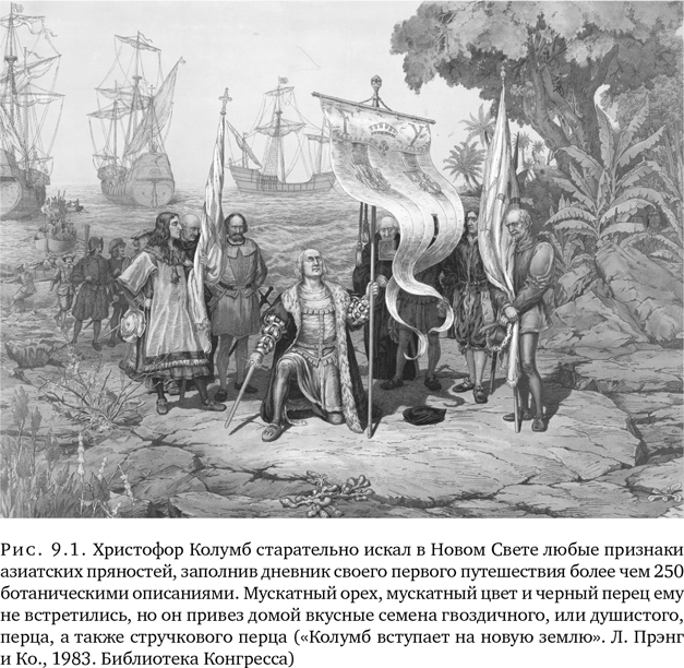 В XV в. пряности добирались до Европы через такое количество посредников и по такой сложной сети азиатских и арабских торговых путей, что люди, покупавшие товар, в итоге видели только конечный продукт, почти не представляя, как и где эти пряности растут. Популярные мифы предлагали искать пылающие деревья, охраняемые змеями, разглядывать прутики в гнездах арабских птиц или собирать ветки и ягоды в самом раю. Марко Поло, по крайней мере, соотносил пряности с реальными растениями, растущими в реальных местах: в Индии и на Молуккских островах. Но для соотечественников великих путешественников даже названия этих диковинных мест казались сказочными, не говоря уже об их географическом положении и тем более флоре. Когда Христофор Колумб встречал новое растение он, должно быть, нюхал его кору, ища намеки на корицу, пробовал цветочные почки, надеясь найти гвоздику, и скреб корень в поисках имбиря. Потом он, вероятно, обращал внимание на их семена — источник самых ценных специй того времени: мускатного ореха, мускатного цвета и черного перца[15].