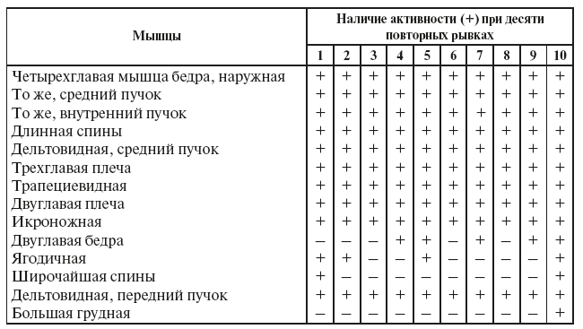 Уже Н.А. Бернштейн отмечал, что даже достаточно простые навыковые действия не являются полностью стереотипными. При многократных повторениях они могут различаться по амплитуде, скорости выполнения отдельных элементов и т. д. Как оказалось, еще больше они различаются по внутренней структуре. Многоканальная регистрация ЭМГ различных мышц при выполнении спортивных упражнений показала, что в одних и тех же освоенных движениях значительно варьирует состав активных мышечных групп. Одни мышцы включаются в движения постоянно, а другие – лишь периодически (табл. 12). Варьируют длительность фаз, мышечные усилия, последовательность включения мышц. Это позволило говорить о закономерной вариативности внешних и внутренних компонентов двигательного навыка (Зимкин Н.В.,1975). Наличие вариаций позволяет отбирать оптимальные и отбрасывать неадекватные моторные программы, учитывать не только внешние изменения ситуации, но и сократительные возможности мышц. Вариативность особенно выражена в периоды врабатывания, перед отказом от работы и в восстановительном периоде. Регистрация активности отдельных нейронов головного мозга (в экспериментах на животных и в клинике при лечебных мероприятиях) показала значительную вариативность их включения в одни и те же освоенные действия. При этом между ними образуются как «жесткие» (стабильные), так и «гибкие» (вариативные) связи (Бехтерева Н.П., 1980).