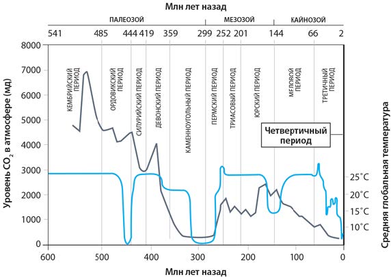 Состав атмосферы и климат значительно изменились за последние 600 млн лет. График показывает, что глобальная температура (голубая линия) во время мезозоя была в целом высокой, отчасти потому, что уровень углекислого газа в атмосфере (серая линия) тоже был высок