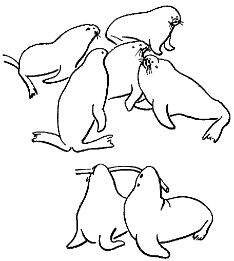 Внизу — два щенка новозеландского морского льва (по фотографии Б. Марлоу) пытаются завладеть куском стебля морской травы, демонстрируя элементы будущего взрослого территориального поведения. Вверху — разгар территориального конфликта между секачами северных морских котов (в окружении четырех законных владельцев своих территорий незадачливый вторженец, блокированный собственниками, каждый из которых, в свою очередь, не может выйти за пределы своего крошечного удела, не будучи атакован потревоженным соседом)