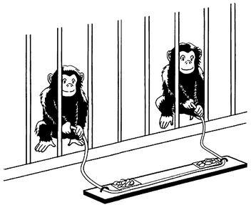 Чтобы подтянуть к себе эту дощечку, оба шимпанзе должны тянуть трос одновременно, поскольку если потянуть его только за один конец, он выскочит из скоб, как шнурок из ботинка. Итак, оба шимпанзе должны действовать сообща, одновременно тянуть за оба конца троса, чтобы подвинуть к себе дощечку и заполучить пищу.
