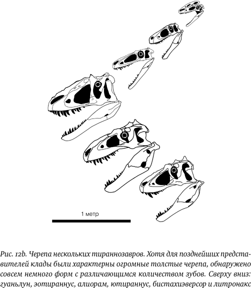 Изменения в размере и форме головы были очевидной и главной модификацией (рис. 12b). Не считая гребней на головах процератозавридов, влиявших, скорее, на внешний вид, череп у ранних форм был в целом довольно небольшим. У гуаньлуна череп выглядел пропорциональным по отношению к остальному телу: он не казался какой-то неестественно увеличенной чудовищной конструкцией, как у тираннозавра, но смотрелся бы уместно практически на любом тероподе. Однако у более поздних тираннозавроидов, например ютираннуса, голова стала больше по всем параметрам (в особенности по высоте) и начала выглядеть как доминирующая часть тела животного. Эта особенность была сходной у алиорама и дасплетозавра, а у тираннозавра и тарбозавра голова поистине заняла господствующее положение. Она не просто стала больше и выше (за исключением алиораминов), но также более массивной и прочной. У ранних представителей группы опорные кости, задающие очертания черепа, в особенности вокруг отверстий по бокам, были довольно тонкими – между ними много места, – но у тираннозавринов они стали куда более толстыми и прочными. Аналогично при переходе от ранних форм к поздним зубная кость и мандибула в целом сделались более глубокими и прочными, и особенно увеличились они у тираннозавринов. В общем, в голове стало значительно больше костной массы, чем раньше, и, хотя одно это не делало ее крепче, все же предполагается, что данные животные развивали все более мощный укус, а также череп, способный выдержать большие нагрузки.