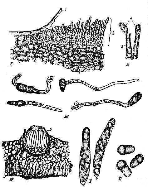 Рис. 3. Микроскопическая картина сумчатой Venturia inaequalis (Cke) Wint. и конидиальной Fusicladium dendriticum (Wallr.) Fuck, стадий гриба, вызывающего паршу яблони: I — поперечный разрез пятна парши на плоде: 1 — разрушенные клетки кожицы и мякоти плода; 2 — грибница со спорами; II — конидиеносцы с конидиями: 3 — конидиеносцы; 4 — конидии (летние споры); III — прорастание конидий; IV — разрез через зрелый перитеций на перезимовавшем листе яблони (видны сумки); 5 — шейная часть перитеция, выступающая над поверхностью листа; V — сумки с аскоспорами; VI — двух-клеточные аскоспоры, освободившиеся от сумок (сильно увеличено)