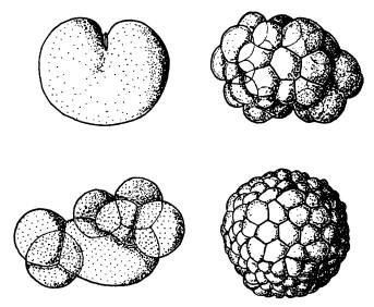 Делящаяся яйцеклетка (слева наверху), морула в виде комка клеток (слева внизу), бластула в виде полого шарика (справа внизу и вверху). На всех этих стадиях развития животных геном обычно не функционирует. На рисунке — развитие медузы Aequorea.