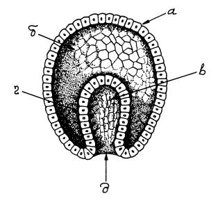 Типичная гаструла многоклеточного животного. а — эктодерма (наружный зародышевый листок), б — бластоцель (первичная полость тела), в — первичная кишка, г — энтодерма (внутренний зародышевый листок), д — бластопор (первичный рот).
