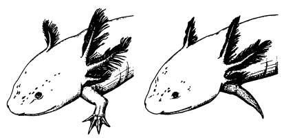 Нормально регенирировавмая после ампутации конечность аксолотля (слева) и недоразвитая конечность у особи, которой был введен Axin1 — ингибитор Wnt-каскада.