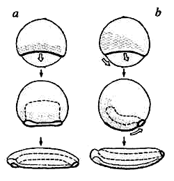 Великая развилка. Налево пойдешь — станешь червячком или мухой, одним словом, беспозвоночным, направо — позвоночным. Эта развилка не сохранилась в слоях земных, но память о ней хранит эмбриональное развитие любого многоклеточного животного. Все у нас и червей начинается с яйца и на первых порах разворачивается похоже: в нижней части яйца развивается нервный тяж, вокруг которого как бы нарастает все остальное. Но тут-то и расходятся пути. Эмбрион нашего родича по подтипу черепных позвоночных лягушки как бы переворачивается, и нервный тяж, вокруг которого впоследствии образуется хорда и позвоночник, оказывается в спинной части тела. Беспозвоночные никуда не переворачиваются, у них нет спинного хребта, нервный тяж остается на брюшной стороне. Эмбрионы еще похожи, но они уже в корне противоположны.