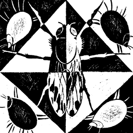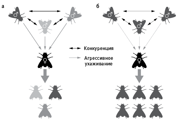 рис. 14.1. Схема эксперимента по влиянию родства между самцами на репродуктивный успех самок дрозофил. Три неродственных самца, посаженные в пробирку с самкой (а), агрессивно конкурируют друг с другом и назойливо ухаживают за дамой. В результате та быстро стареет и оставляет меньше потомков. Три родных брата в такой же ситуации (б) конфликтуют реже и не так активно пристают к самке. В результате она стареет медленнее и оставляет многочисленное потомство. По рисунку из Carazo et al., 2014.