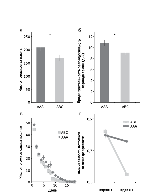 рис. 14.2. Родство между самцами повышает репродуктивный успех самок. a — общее число потомков, произведенных самкой, в двух экспериментальных ситуациях: когда конкурирующие за нее самцы родственны друг другу (AAA) и неродственны (ABC). б — число дней, в течение которых самка продолжала размножаться (от вылупления из куколки до откладки последнего яйца). в — количество яиц, отложенных самкой в каждый день жизни. Видно, что репродуктивная функция самок в ситуации ABC снижается быстрее, чем в AAA. г — выживаемость потомства (доля яиц, из которых вывелись потомки, дожившие до зрелости) в зависимости от возраста самки. Видно, что в ситуации ABC этот компонент приспособленности самок тоже снижается быстрее. Везде представлены усредненные данные. По рисунку из Carazo et al., 2014.