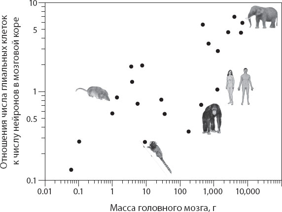Однако дело было лишь в том, что до того времени мозг человека был самым большим из исследованных. В 1987 году, пользуясь тканью мозга финвала (масса этого мозга была равна 7 кг), исследованного Дональдом Тауэром и Алланом Эллиотом[183], Хокинс и Ольшевский[184] обнаружили намного более высокое соотношение глия/нейроны в коре головного мозга кита – 4,54 в сравнении с 1,78 в коре человеческого мозга массой всего 1,5 кг. «Прогрессивное развитие» оказалось ни при чем, отношение глия/нейроны, скорее всего, просто отражает размер головного мозга, что было подтверждено Гербертом Хаугом в довольно убедительном метаанализе дюжины видов[185], проиллюстрированном на рис. 9.1. Хокинс и Ольшевский предположили, что увеличение соотношения глии и нейронов обусловлено увеличением величины нейронов, что на фоне удлинения процессов должно было «потребовать большей помощи со стороны поддерживающей ткани для полного удовлетворения метаболических потребностей». Казалось, что все сходится: Дональд Тауэр[186], исследовав в совокупности ряд видов млекопитающих, показал, что в мозгах большей массы ниже плотность упаковки нейронов, что позволяло говорить об их большем размере[187]; интуитивно ясно, что более крупные нейроны требуют больше энергии, а значит, требуют наличия большего числа поддерживающих глиальных клеток, следовательно, в более крупном мозге выше соотношение числа глиальных клеток к числу нейронов.