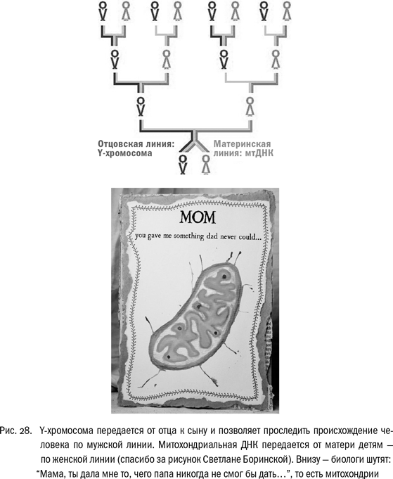 До сих пор у нас еще не заходила речь о митохондриальной ДНК (мтДНК), а она чрезвычайно важна и для судебной медицины, и для исторической науки, и для эволюционных исследований. Митохондрии – клеточные органеллы, которые имеют собственный небольшой геном и самостоятельно размножаются внутри клетки. Но природа устроила так, что ребенок наследует все митохондрии от матери, из яйцеклетки. Если с ядерным геномом все четко – половина от мамы, половина от папы, то митохондриальная ДНК у нас только мамина. Таким образом, у нас есть Y-хромосома, чтобы прослеживать родство по мужской линии, от отца к сыну, и мтДНК – для женской линии, от матери к дочери. (Естественно, у сыновей мтДНК тоже мамина, передать ее своим детям они не смогут, но происхождение мужчины по женской линии тоже можно установить.) Как и Y-хромосома, мтДНК переходит из поколения в поколение неизменной, если не считать мутаций.