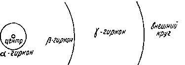 Ориентируя гирконные виды относительно центра, как более близкие и более далекие, и беря, хотя бы и крайне приблизительно, как это делается при построении «родословных деревьев», масштаб, отражающий это расстояние, мы можем поставить себе задачу некоторого графического изображения строения гиркона, схематического взаимного расположения гирконных видов как относительно центра, так и относительно друг друга. Такая графика гиркона была бы очень полезной для гибридизатора при разработке планов его работы. Выбрав термин «круг», «концентр», мы тем самым как бы приняли концентрическую схему, строения гиркона (рис. 20).
