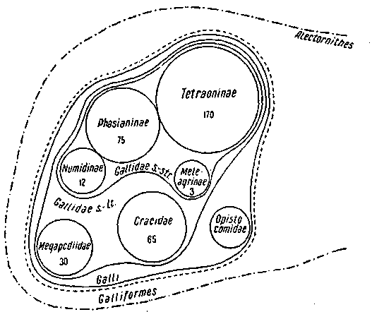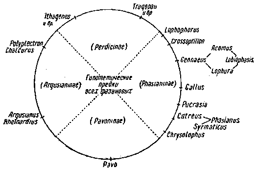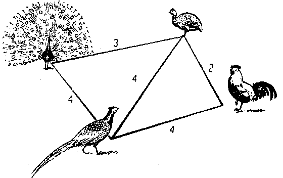Рис. 23. Схема взаимных отношений четырех родов куриных (по Полю).