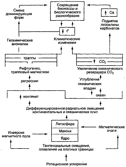 Движущей силой изменения и эволюции биосферы выступает ее взаимодействие с геологическими оболочками Земли, периодически принимающее характер кризиса. Конечно, эволюционные преобразования в биосфере совершаются и в спокойные межкризисные периоды, но их масштабы неизмеримо скромнее. Для быстрых и радикальных перемен необходим толчок извне. Когда он возникает и оказывается воспринятым биосферой, импульсы от нее по нисходящей каузальной цепочке идут к подчиненным ей системам — биоценозам, популяциям, генофондам. Наиболее вероятен следующий порядок развертывания геологических событий (рис. 29).