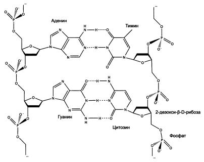 Фрагмент двойной цепи ДНК. По краям — «скелеты» одиночных цепей, составленные из остатков дезоксирибозы и фосфорной кислоты. В центре — две пары азотистых оснований, соединенных друг с другом по принципу комплементарности. Между аденином (А) и тимином (Т) образуются две водородные связи, между гуанином (Г) и цитозином (Ц) — три. Поэтому аденин может склеиться только с тимином, а гуанин — только с цитозином.