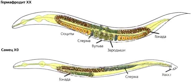 В природе у С. elegans существуют два пола, гермафродиты XX и самцы ХО. Гермафродиты и самцы демонстрируют несколько пол-специфичных анатомических особенностей, наиболее заметными из которых является хвост самца, предназначенный для спаривания, и вульва на вентральной поверхности у гермафродитов для получения спермы самца и для откладки яиц. Программы зародышевого пути у них также различаются. Двуплечая гонада у гермафродитов вначале продуцирует сперму, а затем ооциты на протяжении всей жизни взрослой особи. Одноплечая гонада самцов постоянно продуцирует сперму (адаптировано, с любезного разрешения авторов, из Hansen et al., 2004 [©Elsevier])