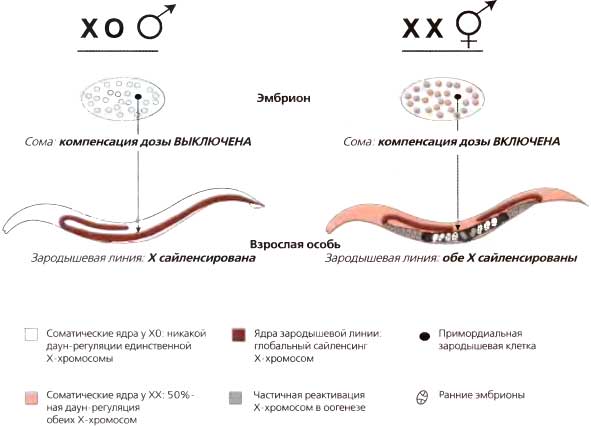 Компенсация дозы происходит в соматических тканях исключительно у гермафродитов XX Сайленсинг Х-хромосом происходит и у самцов ХО, и у гермафродитов XX. Гермафродиты демонстрируют позднюю и частичную активацию сцепленных с X генов во время поздней пахитены оогенеза. Стрелки указывают на единственную примордиальную зародышевую клетку в эмбрионе, которая генерирует зародышевую линию во взрослой гонаде